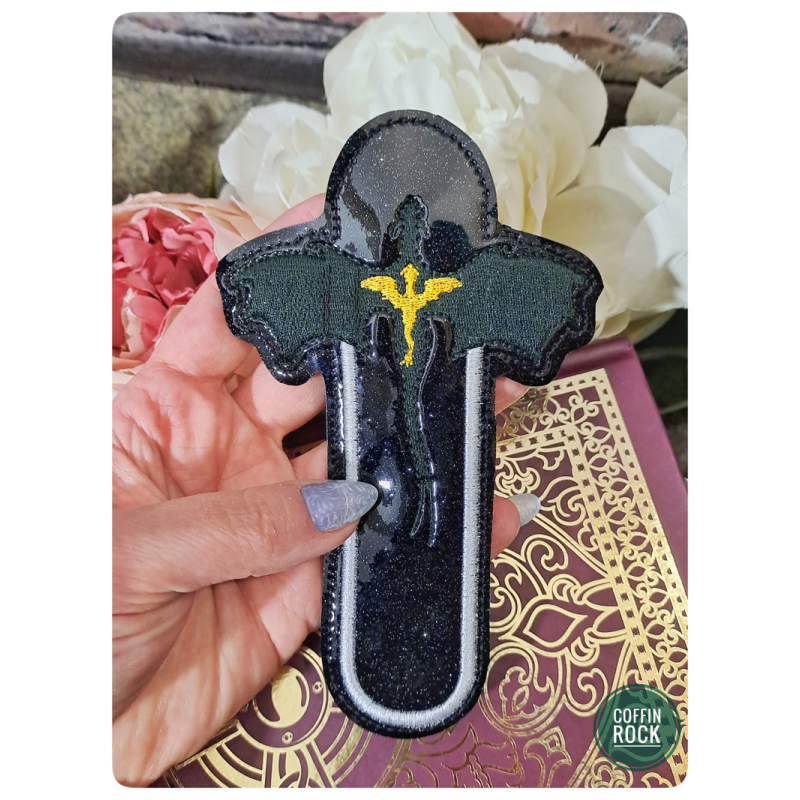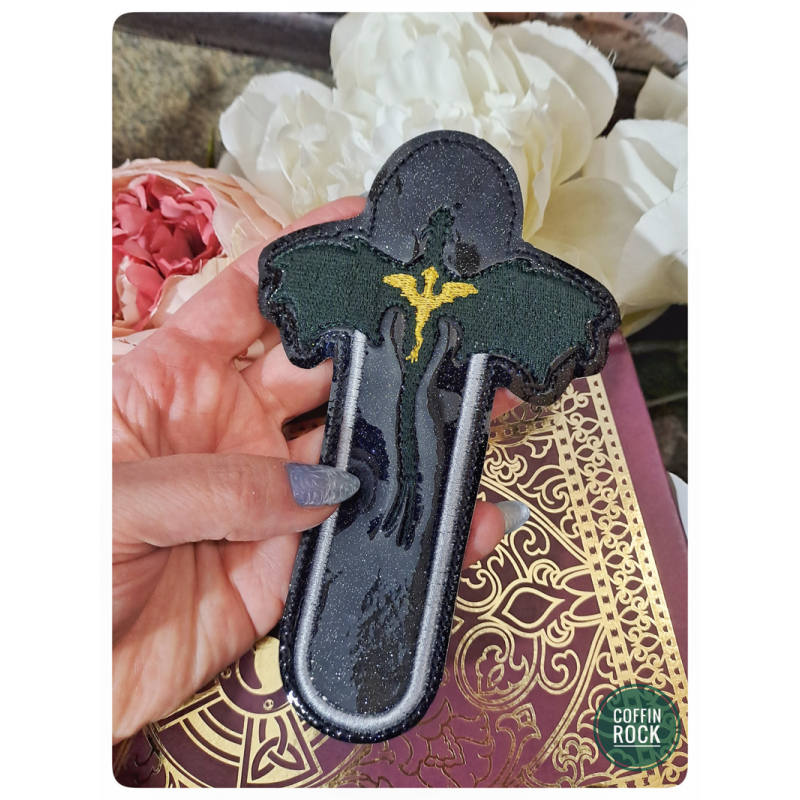 dragon bookmarkblack vinyl with glitter for a starry night effectdark green embroidery for the large dragon and gold for the small onedimensions: 15.5 x 10 cm