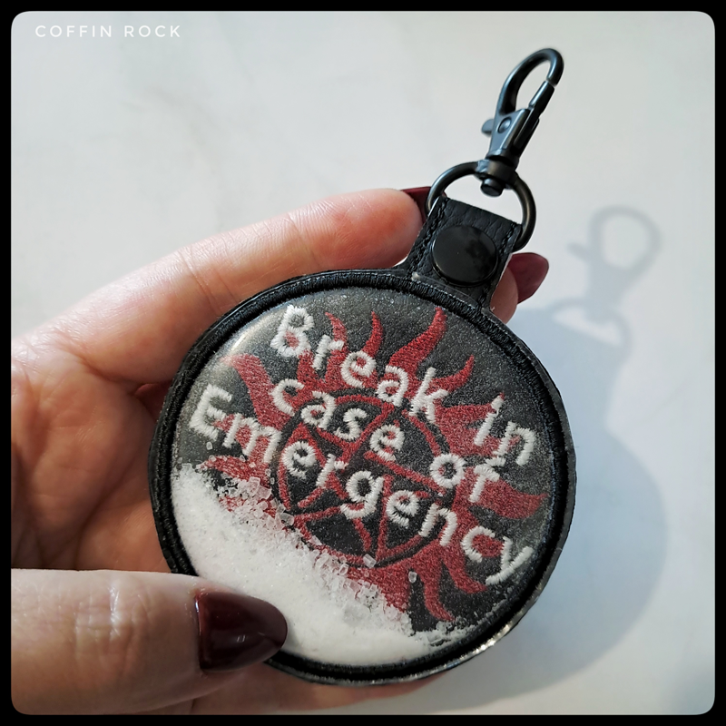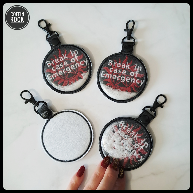 Special supernatural keyringwith real salt inside, to be used only in the presence of demons!Dimensions: 7.5 cm in diameter