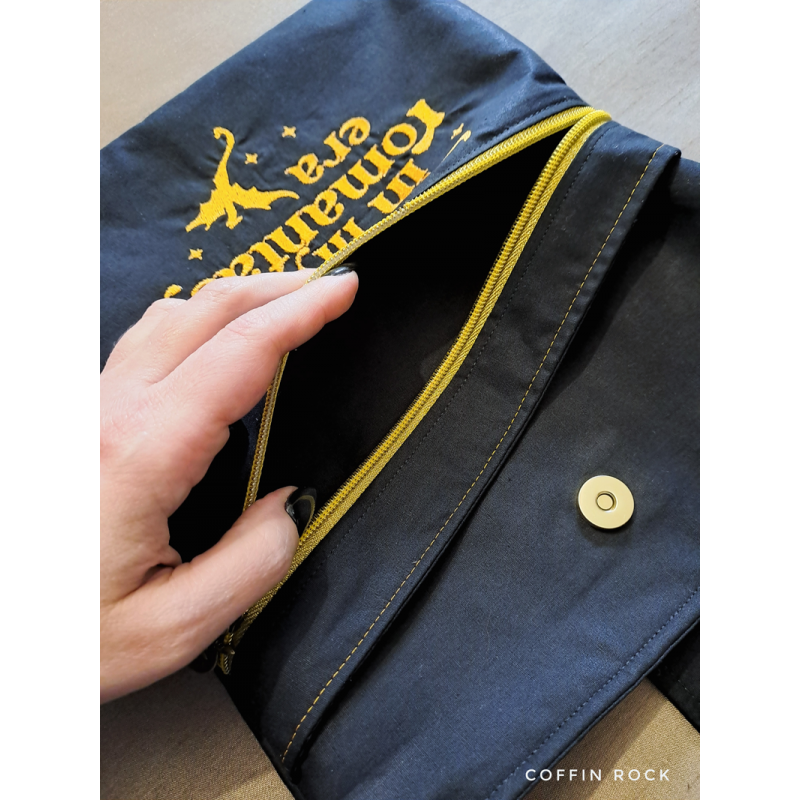 ACADEMIA sleeve: 3 pockets, 1 large padded pocket to comfortably hold your book, closes with a magnetic flap, 1 patch pocket on the front to slip in a notebook or e-reader, and 1 pocket with a zip closure to store your pens or other small accessories