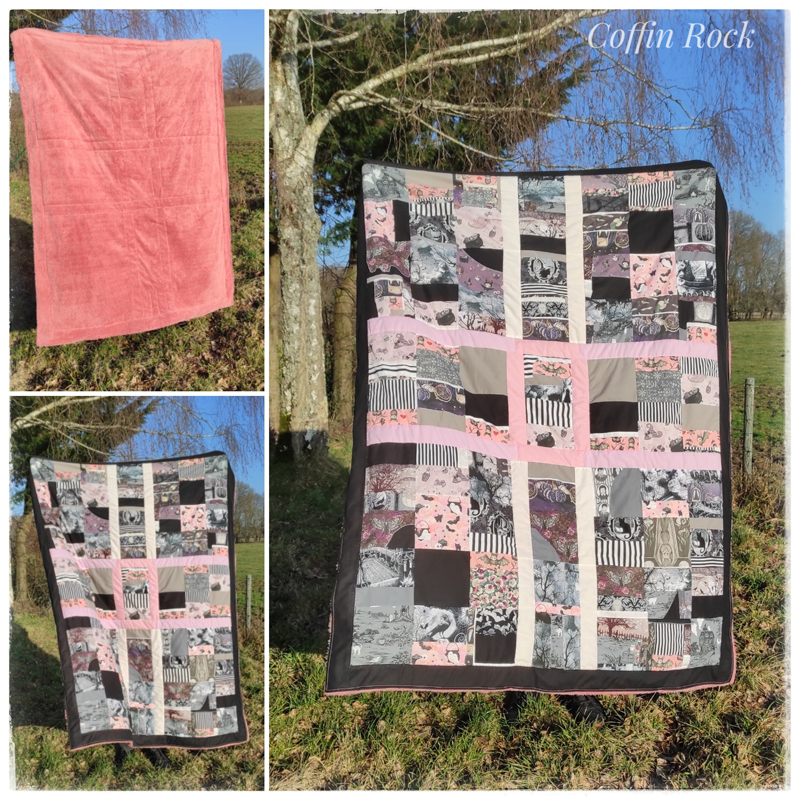 This blanket was made possible thanks to the creator Little Black Owl who provided me with some of the scraps that I used for this production. I invite you to discover her fabulous work on social networks, in addition, she is a very nice human :) There are of course some pieces of fabrics from my personal stock, and the cover on the back is new.