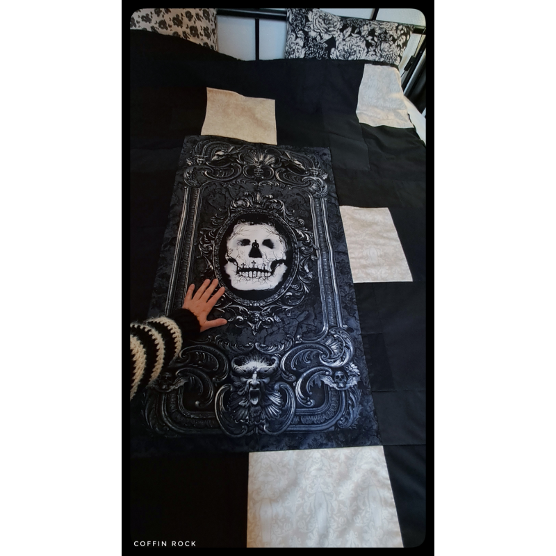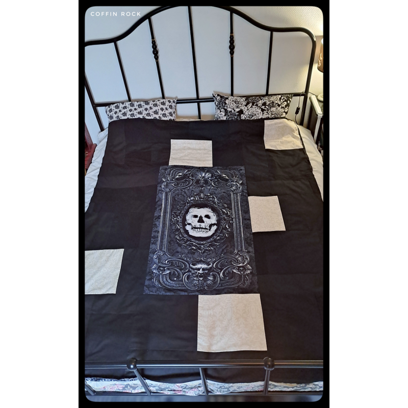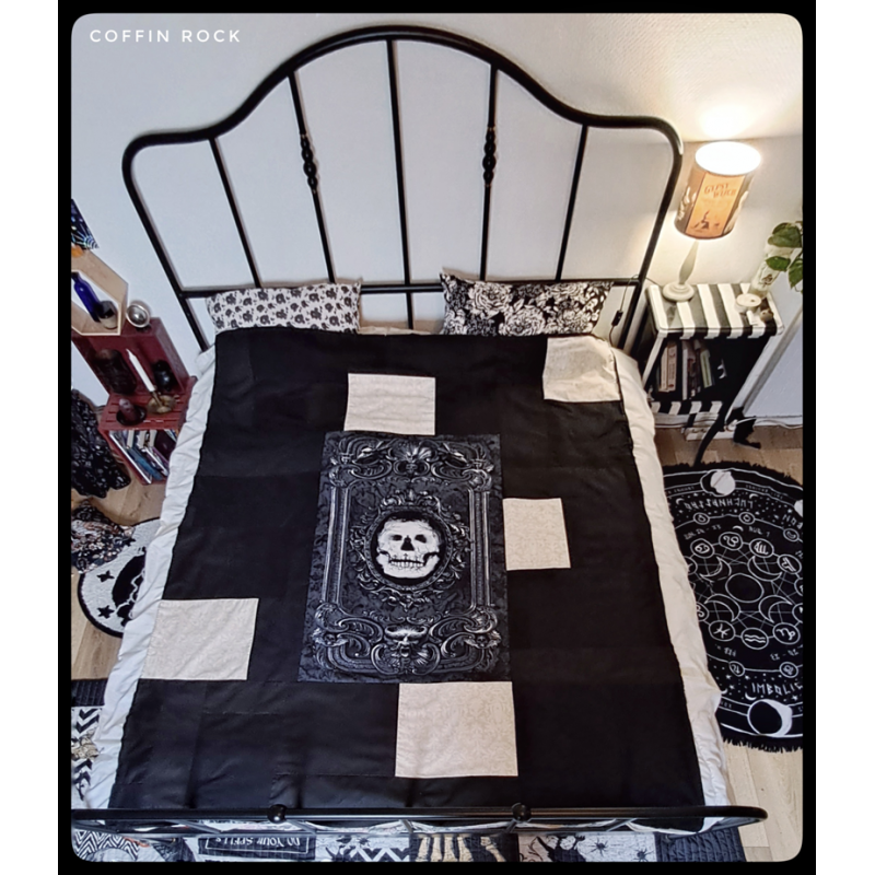 This blanket was made possible thanks to the creator Little Black Owl who provided me with some of the scraps that I used for this production. I invite you to discover her fabulous work on social networks, in addition, she is a very nice human :) There are of course some pieces of fabrics from my personal stock, and the cover on the back is new.