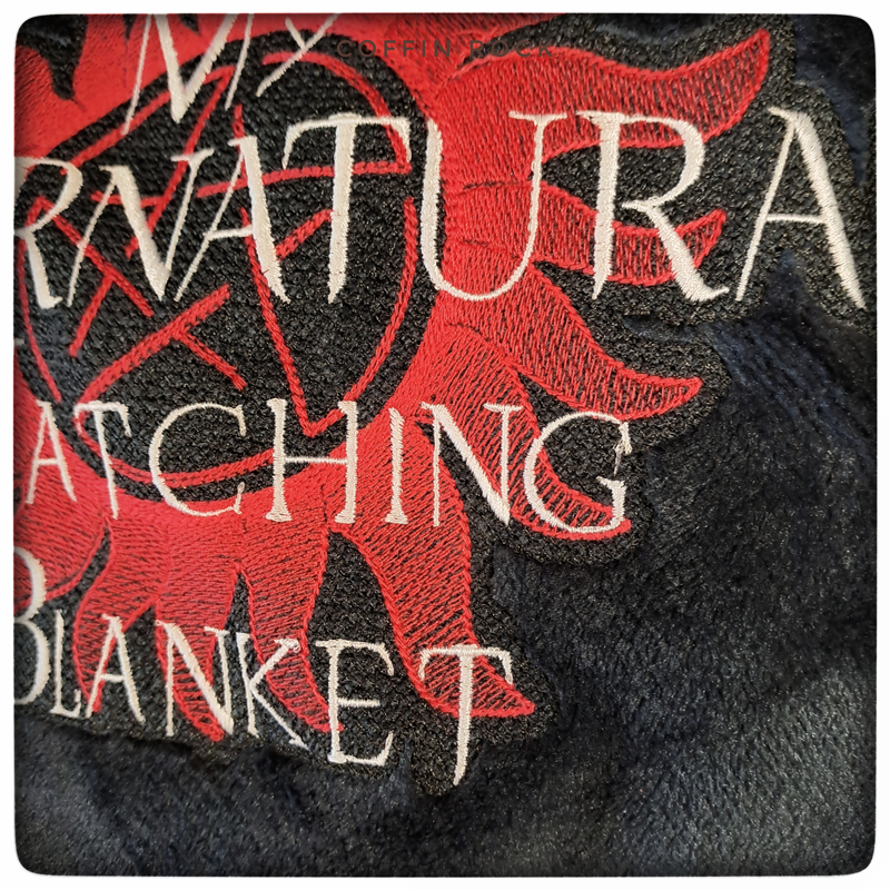Pattern: anti-possession pentagram embroidery and white lettering.