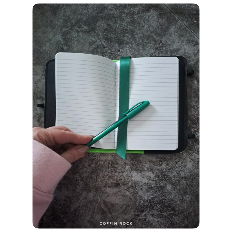 slipping in a pen (supplied with it), notebook also supplied