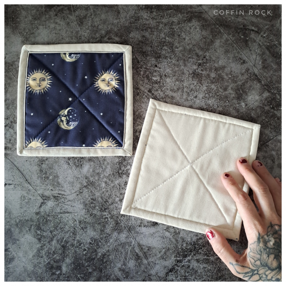 They can also be used to protect your hands from the burns of a hot kettle or teapot thanks to a special padding in the middle, so you can use each square in three different ways (four if you add decoration, because you can of course put your square on your magic altar, in your interior or kitchen decoration)