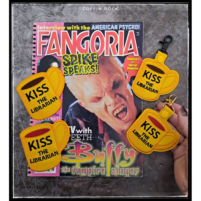Kiss the librarian - cette scène EPIQUE où Spike est "prisonnier" chez Giles et qu'il doit être nourri, Buffy fait donc réchauffer une poche de sang au micro-onde et la seule tasse qu'elle trouve est cette tasse jaune affreuse "kiss the librarian" qui appartient à Giles...