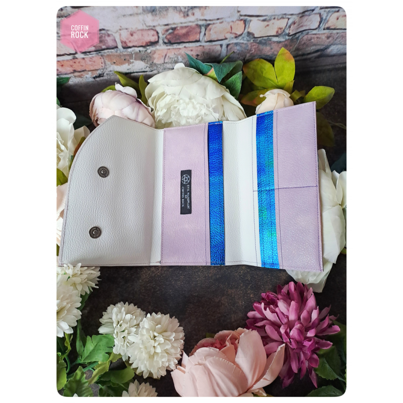 - à l'intérieur : 3 poches plaquées ainsi que 6 espaces pour ranger les cartes (2 poches plaquées sur la gauche et 1 poche plaquée + les 6 espaces pour cartes sur la droite)