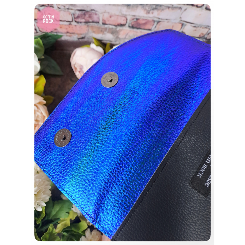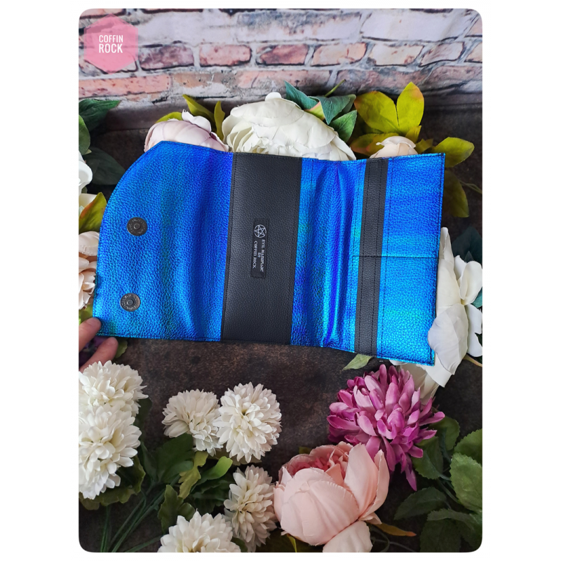 - à l'intérieur : 3 poches plaquées ainsi que 6 espaces pour ranger les cartes (2 poches plaquées sur la gauche et 1 poche plaquée + les 6 espaces pour cartes sur la droite)