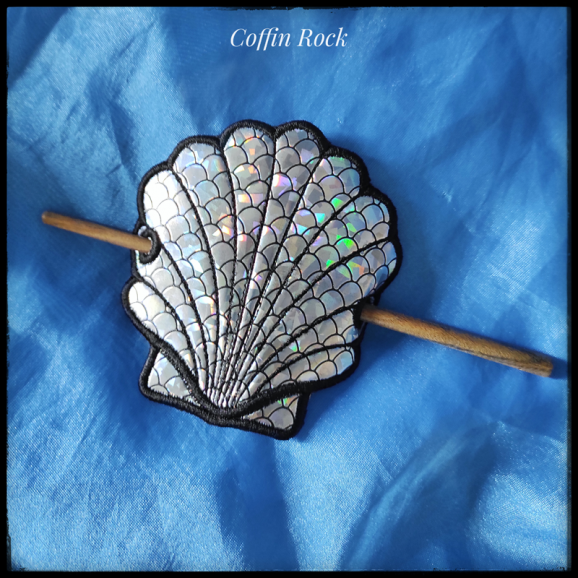 broche à cheveux en forme de coquillage avec un vinyle à écailles brillant.