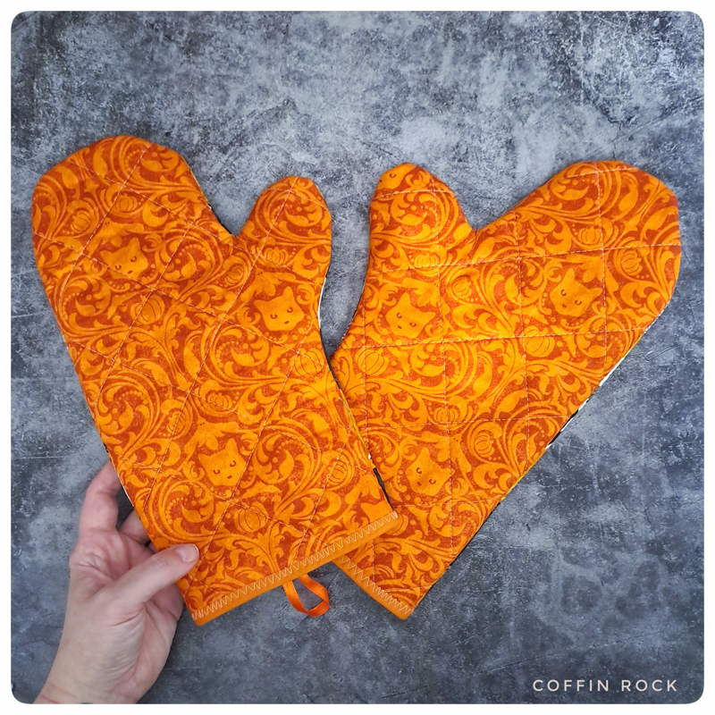 Les gants sont cousus avec une couche de molleton isolant de la chaleur du côté du joli tissu et doublés avec un molleton ignifugé + un molleton isolant du chaud sur la face intérieure qui est celle à utiliser pour tenir les plats. Elle est facile à reconnaître car elle est de couleur unie et a été matelassé (les fils apparent qui font un motif ici des losanges)