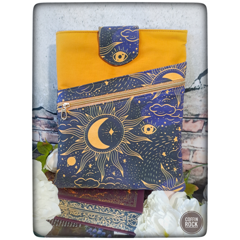 Pochette de livre deluxe, une pochette molletonnée fermée par un rabat magnétique avec une poche plaquée et une poche qui se ferme par une fermeture éclair sur l'avant. c'est un modèle parfait pour les personnes qui annotent leurs livres, souhaitent emporter  écouteurs, liseuse, crayons et surligneurs, marques-pages etc.