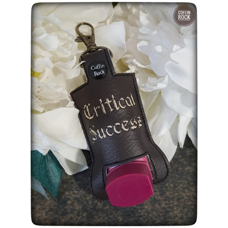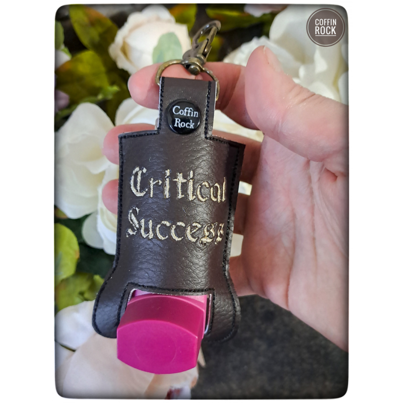 modèle brodé "critical success", sur fond simili cuir marron foncé