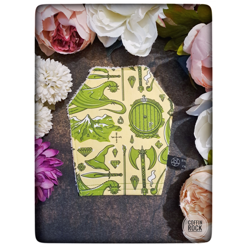 Tissus : motifs inspirés de l'univers de Tolkien, couleur dominante jaune et vert