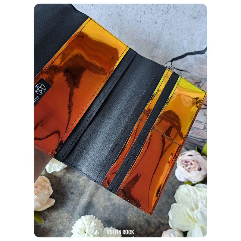 - à l'intérieur : 3 poches plaquées ainsi que 6 espaces pour ranger les cartes (2 poches plaquées sur la gauche et 1 poche plaquée + les 6 espaces pour cartes sur la droite)