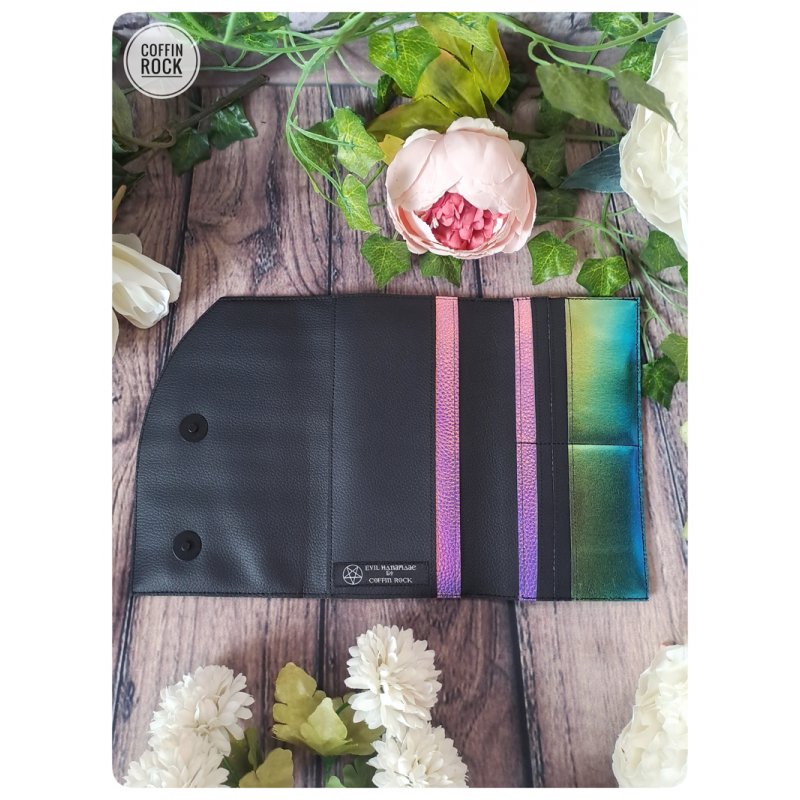 - à l'intérieur : 3 poches plaquées ainsi que 6 espaces pour ranger les cartes (2 poches plaquées sur la gauche et 1 double poche plaquée sur la droite derrière les 6 espaces pour cartes)