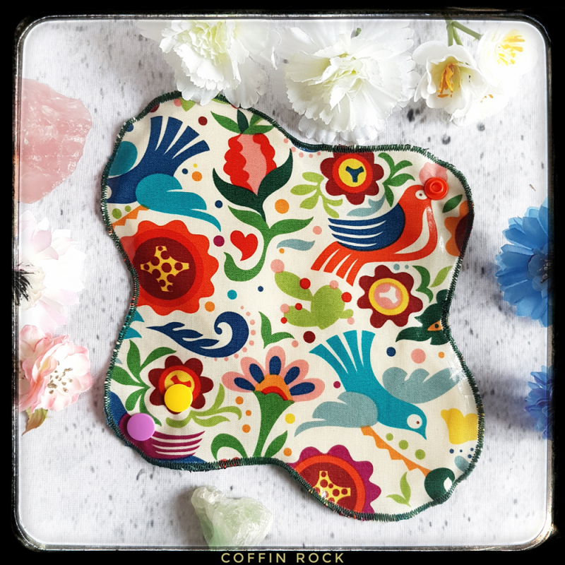 tissus PUL - imperméabilisé avec des motifs fleuris et colorés, tissu absorbant en doublure et tissus coton bio noir ou blanc contre sa vulve, fermeture par velcro ou pression.