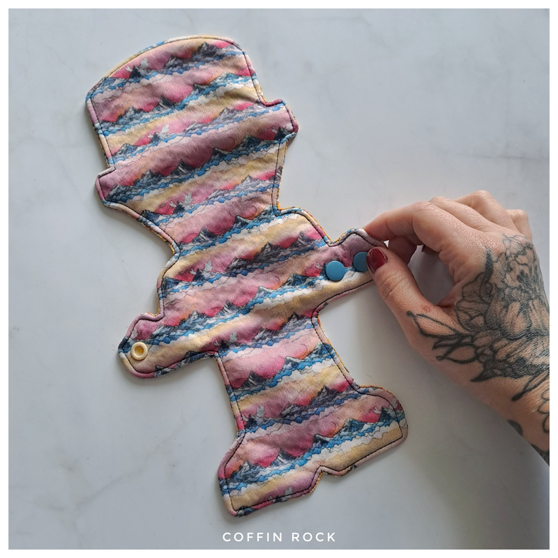 Tissu imperméable montagnes roses, tissu technique très absorbant à l'intérieur et velours milleraie contre sa vulve, fermeture par pression